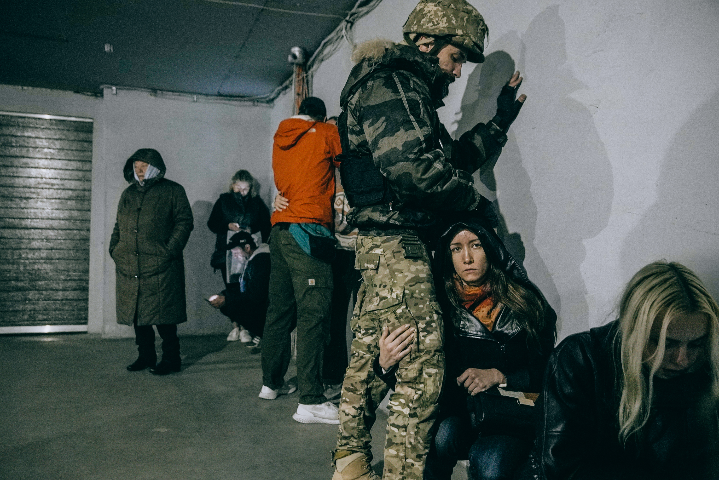 3. A soldier protects a woman in an underground parking lot near a drone strike in Kyiv on 17 October, 2022.